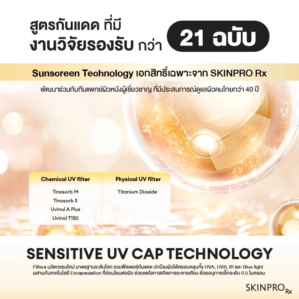 1. Sensitive UV Cap Tech: นวัตกรรมใหม่ขนาดเล็ก ที่นำสารกันแดดที่ปกป้องผิวจาก UVA และ UVB มาห่อหุ้ม ทำให้อ่อนโยนต่อผิวมากขึ้น เหมาะสำหรับผิวบอบบางแพ้ง่าย เป็นสิวง่าย