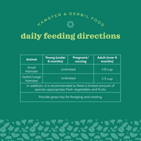 เหมาะสำหรับเป็นอาหารหลัก ให้วันละ 1ครั้ง ครั้งละ 1 ช้อนโต๊ะ (ปริมาณการให้อาหารขึ้นอยู่กับน้ำหนักของสัตว์เลี้ยง) ไม่แต่งกลิ่นและสีไร้สารกันบูด เหมาะสำหรับแฮมเตอร์ เม่นแคระ ดาร์เม้าส์ ชูก้าไรเดอร์ แพรี่ด็อก นก เป็นต้น